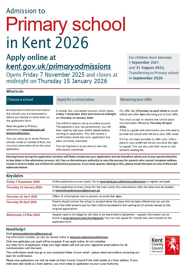 Kent Primary Applications open on Friday 7th November 2025 and close on 15th January 2026